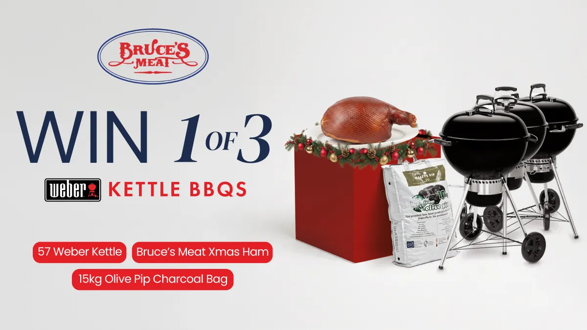 Enter for your chance to take home 1 of 3 brand-new Weber Kettles, a Bruce's Meat Xmas Ham, 15kg bag of Olive Pip Charcoal, and more festive favourites from Bruce’s Meat!